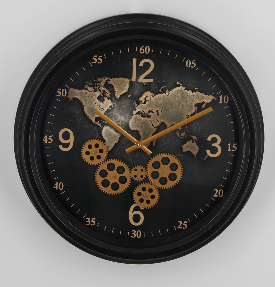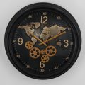 KX-20016, deco wandklok WORLD-2, 50cm dia met draaiende tandwielen, zwart metaal met glas